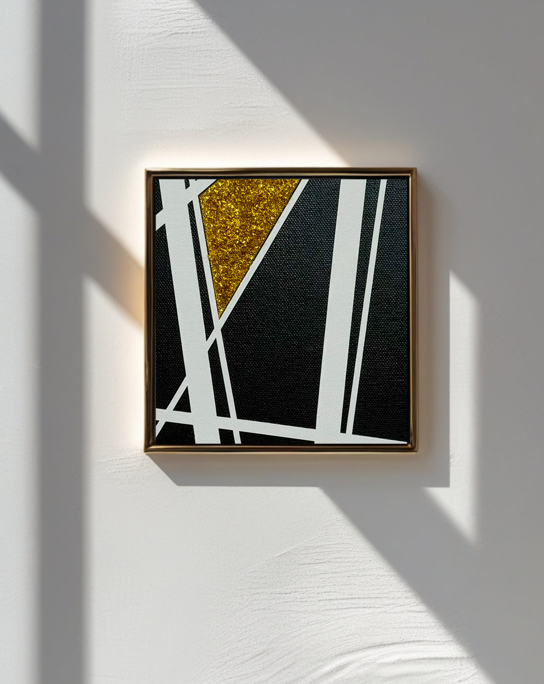 Acrylic paint and spray paint on a box canvas with one section using acrylic paint, structure gel and glitter.